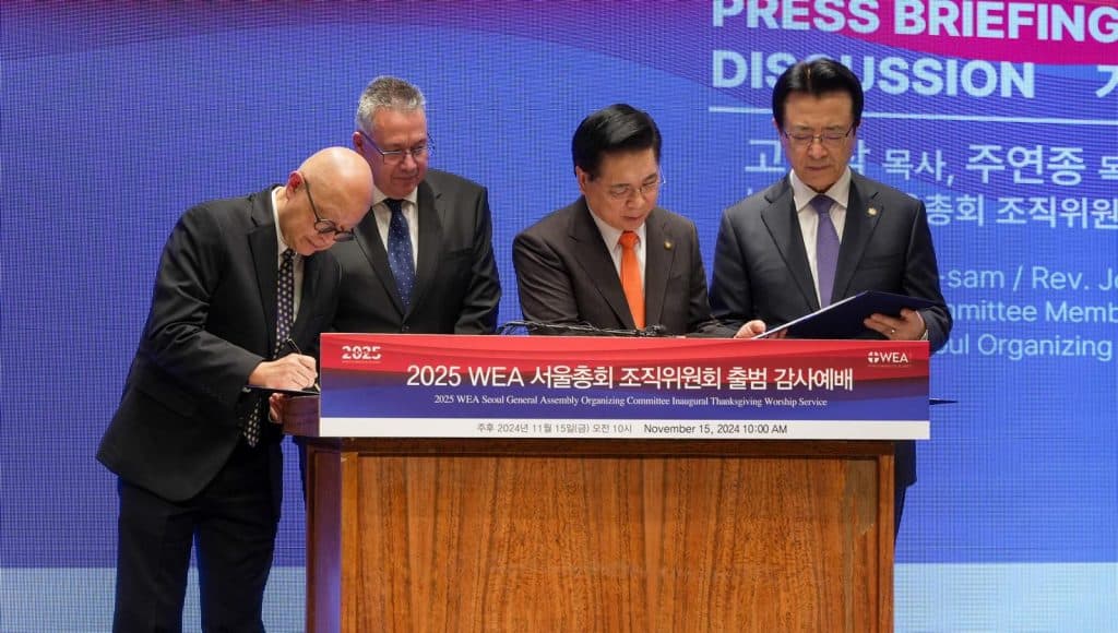 On 15 November 2024, the WEA signed an MOU with the Seoul Organizing Committee to organize the General Assembly in Seoul in 2025. As a unity movement, the WEA looks forward to working with an organizing committee that represents the evangelical churches in Korea. This unity has been modelled through co-chairs Rev. Junghyun John Oh, member of the Hapdong denomination (Prebysterian); Rev. Younghoon Lee, member of the Assemblies of God denomination; and others. The Korea Evangelical Fellowship (KEF), a fellowship of pastors across denominations which is a member of the Asia Evangelical Alliance, is also playing a key role in the Seoul Organizing Committee.